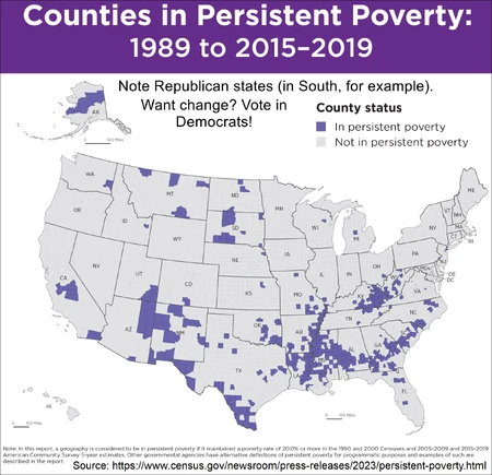 Republican states: Worse healthcare, lower minimum wages, worse cannabis laws. Compare to Canada. US has higher rates of maternal mortality, overdue debt (often medical), poverty, murder, incarceration. Lower percentage of female legislators. Lack of no-excuse postal voting.