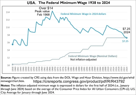 | History of the US federal minimum wage. Over $14 (inflation-adjusted) peak in 1968. $7.25 an hour now due to Republican filibusters in the US Senate. See Wikimedia GIF chart. |